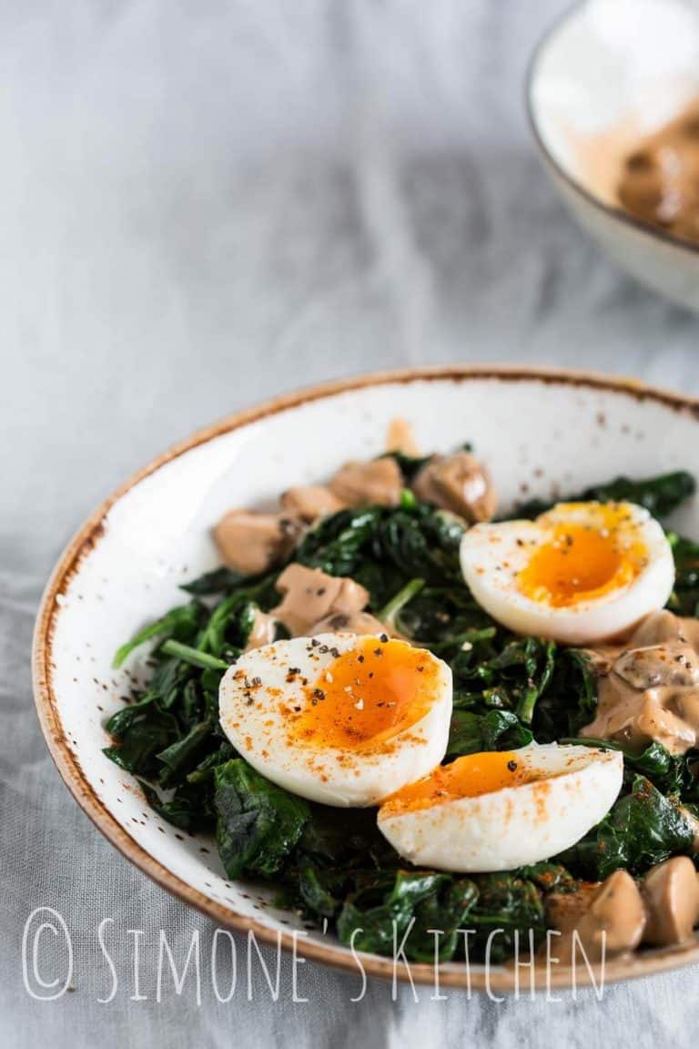 - Roerbak de spinazie kort in een wok. Schep de spinazie op een bord en serveer met de gekookte eieren en de champignon roomsaus. Strooi er een beetje paprikapoeder overheen.