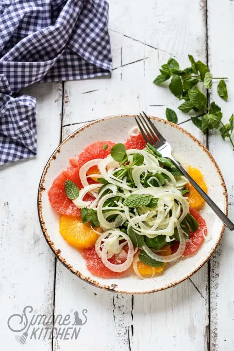 - Maak de dressing door de ingrediënten daarvoor te combineren. Meng dit door de venkel en veldsla en leg dit op de citrusvruchten. Strooi wat van de muntblaadjes eroverheen.