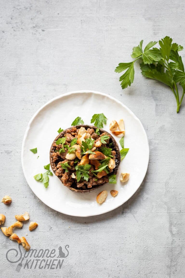 Voor het maken van de gevulde portobello champignons heb ik voor dit recept gehakt gebruikt. Ik voeg wat gesneden uien, verse knoflook en gehakt toe aan de koekenpan en breng het op smaak met zout, peper en pittige harissa. Als je niet van pittig houdt, kun je dit weglaten. Het is ook lekker om wat verse kruiden toe te voegen, zoals verse tijm, verse rozemarijn, verse peterselie of oregano. Als het gehakt gaar is, is het in principe bijna klaar. Je vult de champignons met de vulling en doe er wat gehakte cashewnoten overheen. Zet kort terug in de oven om opnieuw op te warmen en serveer direct. Het is ook erg lekker met een beetje balsamicoazijn erover.