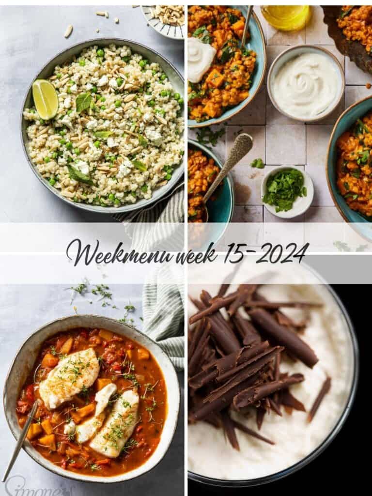 Nu ik dit schrijf begint het net weer te regenen. Zo jammer, want iedereen is zo toe aan wat zon. Hopelijk als dit weekmenu verschijnt ziet het weer er buiten heel anders uit. Als ik dan receptjes aan het zoeken ben, kom ik toch uit op “verwarmende recepten”, is toch gek hoe dat werkt met het weer en eten. Is het zonnig dan eet ik graag salades en is het koud en regenachtig, dan heerlijk stamppot of kruidige maaltijden. En jullie dus ook!