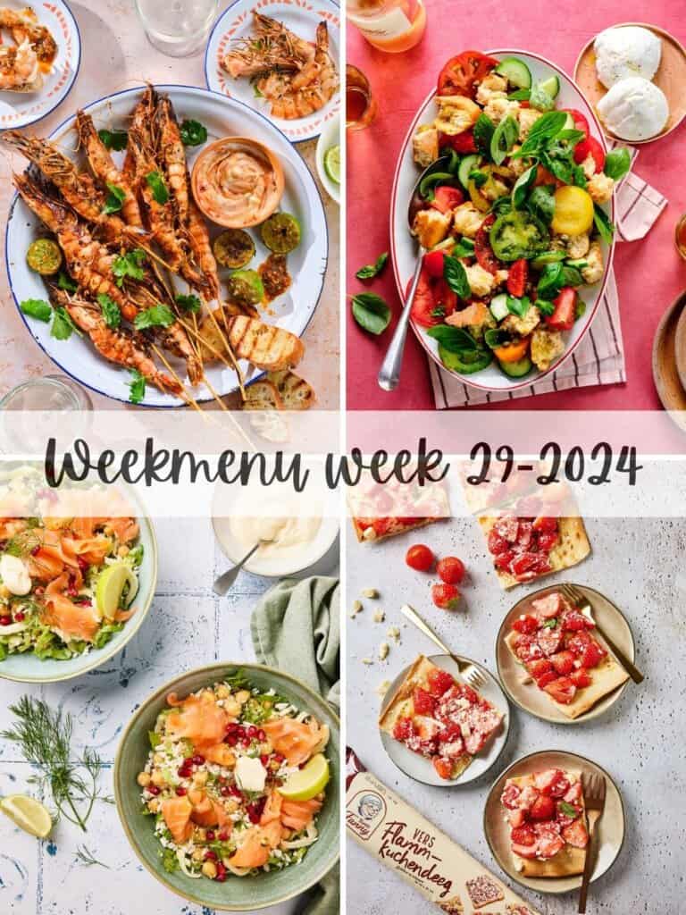 Het nieuwe weekmenu zit vol met zomerse gerechten. Van de lekkerste gegrilde garnalen tot een heerlijke panzanella salade (Italiaanse broodsalade), speltsalade met tomaat en voor de zondag een verrassende flammkuche met chocola en aardbeien. Wil je een gerecht veranderen van het weekmenu dan kun je natuurlijk altijd alle recepten bekijken in de receptenindex.