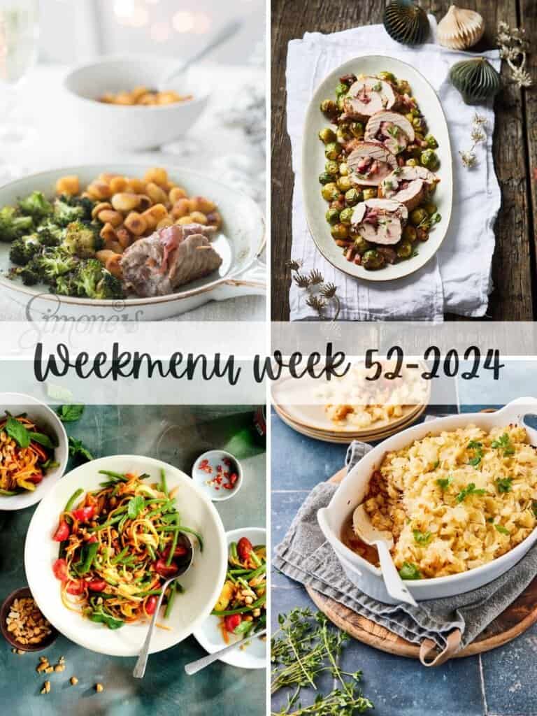 Kerststress, daar heb ik gelukkig niet zo’n last van. Wat ik eerder lastig vind, is wat ik na de kerst zal eten. Heel graag iets lichts, maar zelfs dat is soms teveel. 🙂 Deze week een ietwat schizofreen weekmenu: de ene helft (voorbereidend) feestelijk, de andere helft gezond. Alvast heel fijne kerstdagen gewenst!