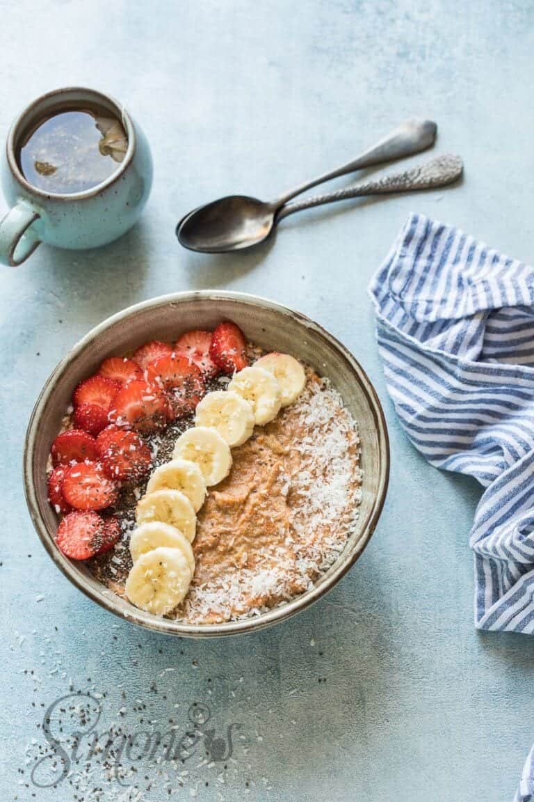 - Maak een kom en beleg deze met de banaan, aardbeien, kokos en chiazaad.