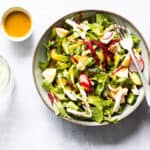 Maak de dressing door alle ingrediënten met elkaar te mengen en serveer deze met de salade en de gekookte aardappeltjes.