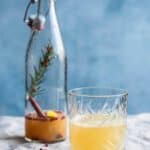 Voor serveren schenk je een beetje van het citrusmengsel in een glas, top het met bruisend water en serveer meteen!