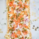 Bestrijk hiermee je plaattaart. Beleg dit met stukken gerookte zalm en verdeel de rode ui, kappertjes en tuinkers erover.
