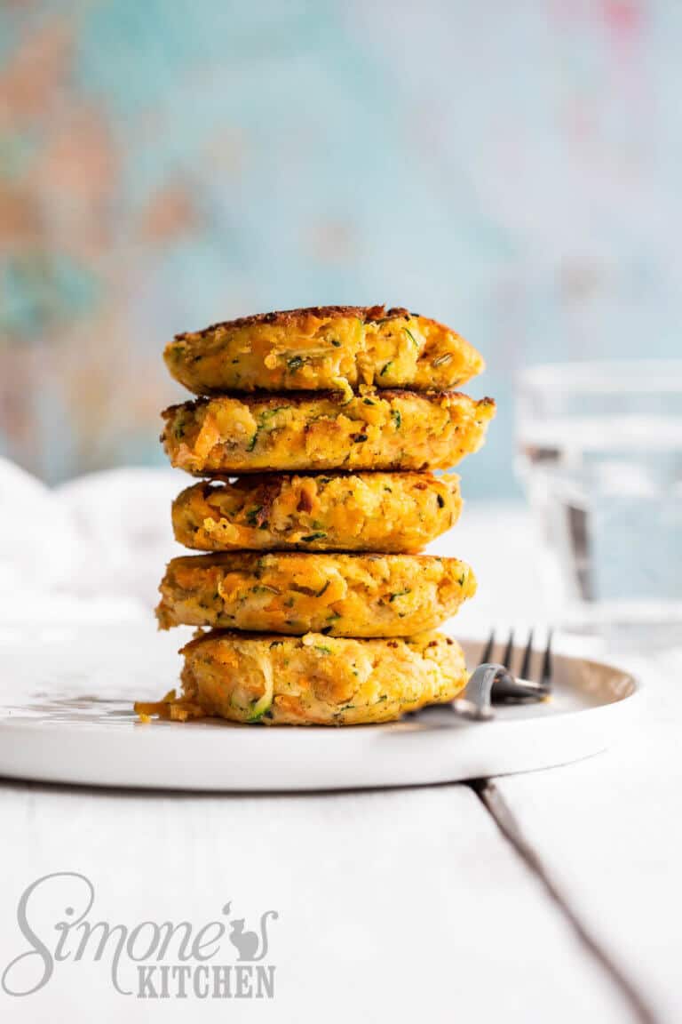 Ik noem ze zoete aardappelkoeken maar er zit eigenlijk net zoveel courgette in als zoete aardappel. Een lekker groenterijk gerechtje dus.